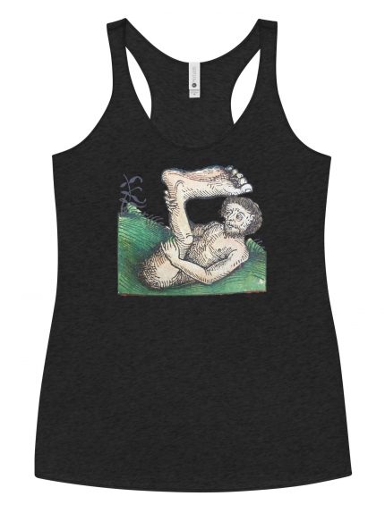 This racerback tank is soft, lightweight, and form-fitting with a flattering cut and raw edge seams for an edgy touch. • High Quality Printed. Image of a Illustration from the Nuremberg Chronicle, by Hartmann Schedel (1440-1514). Monopods (also called sciapods, skiapods, skiapodes) were mythological dwarf-like creatures with a single, large foot extending from a leg…